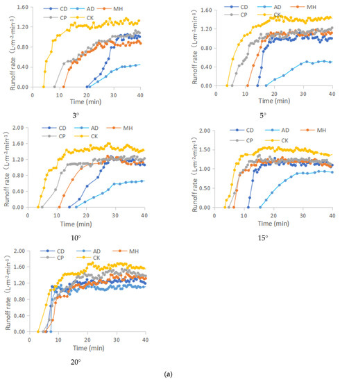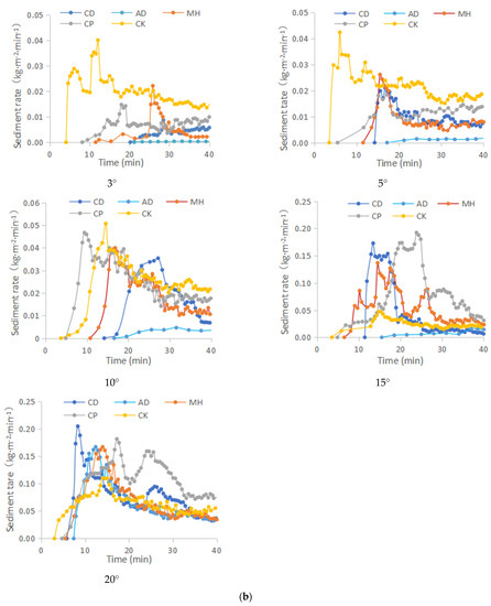The runoff rate hydrograph of the CK significantly exceeded those of the four tillage treatments (Figure 7a). At slope gradients of 3° and 5°, the sediment yield hydrograph of the CK significantly exceeded those of the four tillage treatments (Figure 7b). Under the conditions above, the surface roughness caused by different tillage practices had a significant sediment reduction effect. The effect was more pronounced than the sediment increase associated with rainfall intensity and slope gradient. Higher roughness of the surface soil increases surface microtopography undulations. During rainfall, the roughness of the surface soil restricts the runoff generation, and the retention of rainfall by surface depressions facilitates infiltration. The consideration of a shallow and wide flow, according to the flow depth, can be used to illustrate the effect of splash erosion under different gradients of slope. In particular, the impacts of raindrops under increasing gradients of slope and decreasing volumes of runoff can be examined [51,52,53,54]. The rate of infiltration tends to stabilize as runoff stabilizes. The deposition of sediment by the collapse of furrows results in the initial depression storage initiating runoff generation and the associated transportation of sediments. The different tillage approaches result in reductions in total runoff [55]. Similarly, the roughness of the surface soil increases flow confluence. The breakdown of the surface microtopography results in the appearance of rills and head fall, thereby gradually increasing the yield of sediment and the volume of runoff.