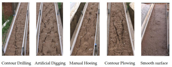 Rough surfaces were manually prepared with the four tillage practices of CP, MH, AD, and CD [29]; a control plot with a smooth surface was also prepared (CK: Figure 2). The practices were as follows: (1) CP represents a customary tillage technique for preparation of new soil for planting. The technique uses one plow for the preparation of a fine seedbed, without creating furrows or ridges. (2) MH—a broad hoe is used for the cultivation of soil at a length of 40–50 cm and a depth of 7 cm, with an average volume slope pit of 0.033 m3. (3) AD represents a manual agricultural practice using a narrow hoe for digging depressions approximately 22 cm wide and 9 cm deep, 20–25 cm from each other, and with a 0.083 m3 average volume slope pit. (4) CD represents a traditional tillage technique in which a “Lou plow” (in Chinese: 耧 [lǒu]) is used for the creation of ridges and furrows, with a slope pit average volume of 0.068 m3, adjacent ridge distance of approximately 15 cm, and ridge height of approximately 6 cm.