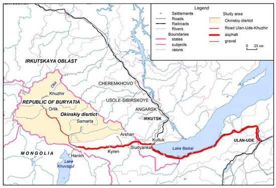 Moreover, even 40 years ago, overland communication between the Okinsky district and the rest of Buryatia was carried out along the Okinsky trail on pack horses. It took four days to get from the nearest village of Mondy (Tunkinsky district, Republic of Buryatia) to the regional center Orlik (Okinsky district) [50]. Only in 1985 did the construction of a gravel road with numerous bridges across the right tributaries of the Oka River begin. The constructed automobile route Mondy–Orlik 81-OP-R3-81K-035 (134 km) is registered as a public road of regional significance.
