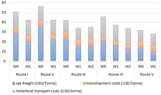 On this route, the most competitive variant in terms of pricing is W1. When applying a Handymax vessel, the freight unit cost throughout the transport chain is lower by 11% compared with transport with a Handysize ship. Similarly, as in the previous variants, this is due to the differences in freight rates, to the advantage of using a Handymax ship. In this case, the freight rate for a Handymax vessel is lower by 26% in comparison with a Handysize one. In Variant W0, the share of the sea freight cost in the total freight cost amounts to 43.7%, whereas in Variant W1 it drops to 36.4%.