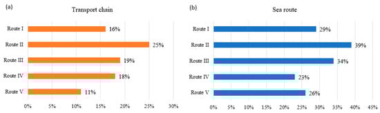 Cost differences between Variants W0 and W1 for all the analysed routes (based on the data as of September 2020) in relation to transport chain (a) and sea route (b).