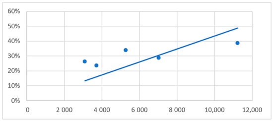 In order to answer Question 2, i.e., “May the fairway deepening lead to increasing the share of cargoes to/from the port’s distant (extra-European) foreland?”, it was necessary to analyse the research results being the sea freight costs for the analysed routes. To that end, a correlation was determined between sea distance (D) and benefits for cargo shippers, which ensued from a reduction in port-oriented supply chain costs (the analysis accounted for Variants W0 and W1). In view of the considerable dynamics of the maritime freight rates, the analysis was based on relative values. Benefits (Bi) for each variant i were determined in % as per the formula: