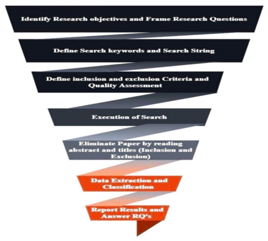 The research approach in this paper follows the different recommendations submitted for the systematic survey performed by [,,,,]. This review was performed in accordance to the PRISMA (Preferred Reporting Items for Systematic Reviews and Meta-Analyses) guidelines.