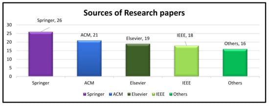 We thoroughly reviewed research articles and conference papers from Scopus, Web of Science, ACM, Research Gate, Google Scholar, books, magazines, and white papers. In Figure 4, we can see the ratio of papers analyzed from multiple sources.
