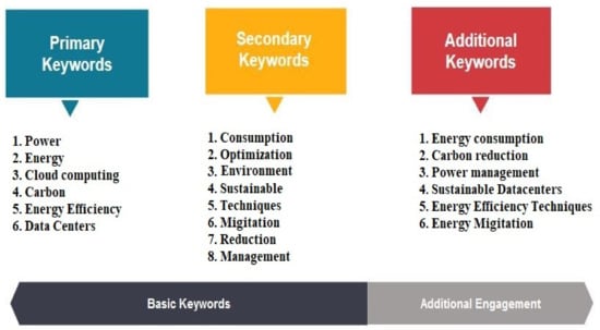 The keywords used for searching were mainly focused on our research questions. The final search strings included primary, secondary, and additional “AND” operation keywords as shown in Figure 5. The primary keywords included basic terms related to energy, power, and cloud computing, while the secondary keywords consisted of general words, such as environment, sustainable, techniques, and reduction. To ensure the search strings cover all related papers, we added some new keywords by performing the ‘AND’ operation, which combines different keywords to enhance our search for related papers.