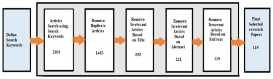 In the first step, we start with formulating the research questions, discussing the origins of information, collection criteria, quality assurance, and analyzing the research paper’s findings. The complete process can be seen in Figure 3. The following segment focused on common keywords from a particular domain, and only relevant combinations of these words were used in the final search strings. In the next step, inclusion and exclusion criteria were defined so that the review contains only the related research papers.