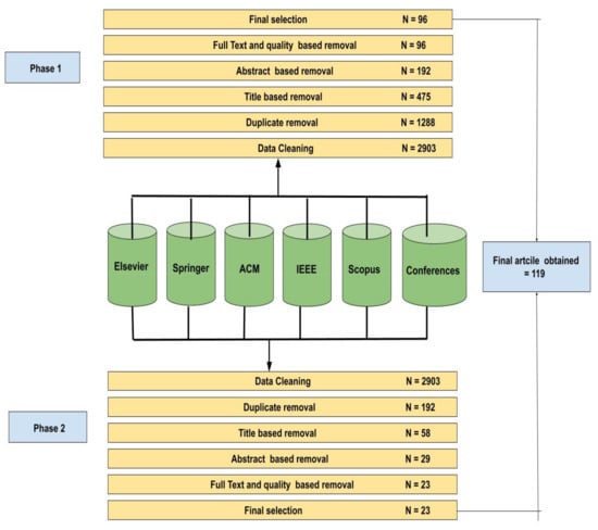We initially reported 2903 relevant articles from six digital libraries and academic search engines published until February 2022. These papers were later examined regarding the title, abstract, full text, manual search, snowballing references, and other perspectives. A total of 119 primary studies (PSs) (Appendix A) were selected after evaluating the quality of articles. To make the following significant contributions, these selected PSs were further investigated.