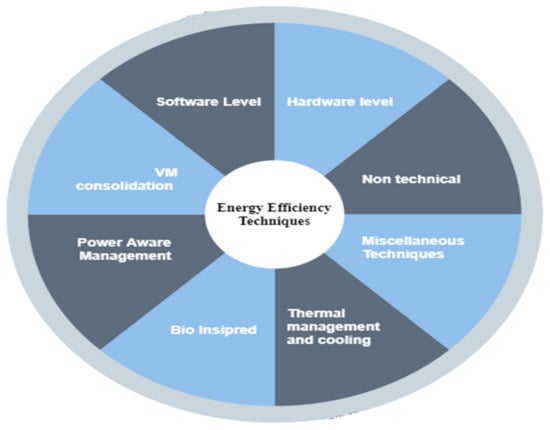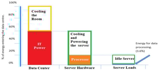This also leads to an improved distribution mechanism for resources and services that will result in a reduction in equipment and in the carbon footprint. As shown in Figure 1, the main task is to decrease the energy drop or loss, which is not consumed by data centers, or energy that does not provide helpful output, such as loss, while running on idle mode [,,,].
