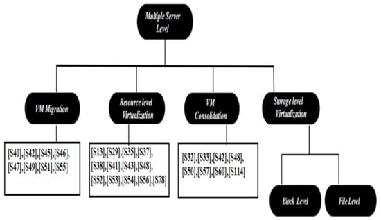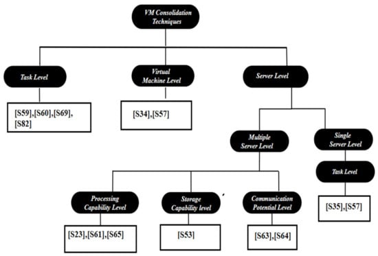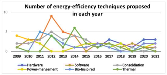 Ref. [] presented research to map out the current state of knowledge on energy efficiency’s impact on cloud computing and, in turn, help to build a better picture of the future of this area of study. No emphasis was given to techniques to reduce energy consumption [,,,,,,,,,,,,,].