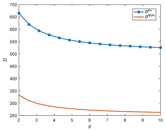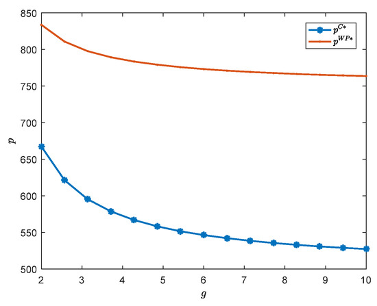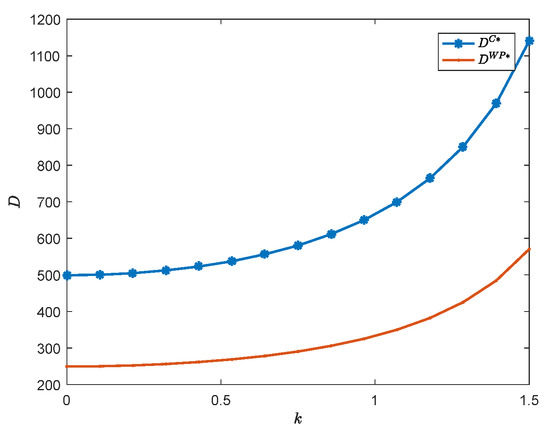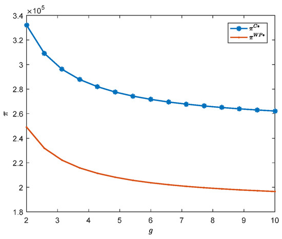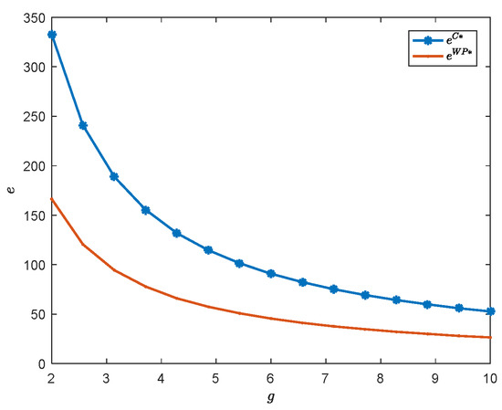 Substituting Equations (A1) and (A2) into π L W P , we obtain 2 π L W P m 2 = 2 g 2 g k 2 . When k 2 g < 2 , then 2 π L W P m 2 < 0 ; that is, π L W P is a concave function in m . Let π L W P m = 0 and obtain m = a c 2 . Substituting m into Equations (A1) and (A2), we obtain w W P * , e W P * . From this, p W P * , D W P * , π L W P * , π F W P * can be obtained. □