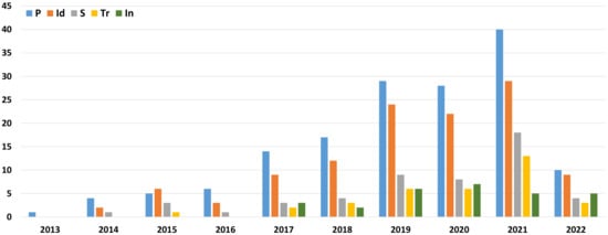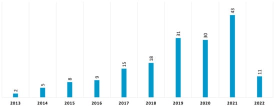 The first works on energy-efficient scheduling problems date back to the 1990s [,,]. However, energy-efficient scheduling has only recently become the subject of systematic research. Figure 1 depicts the number of papers published, between 2013 and the first quarter of 2022, on the energy-efficient job shop problem and its variants (here and hereafter collectively designated as EEJSPs). As can be seen, the number of publications has been growing quickly, particularly since 2018. Between 2013 and 2018, a total of 57 such papers were published, while between 2019 and the first quarter of 2022, this number has gone up to 115 (more than doubling in half of the time).