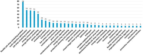 We have also analyzed the usage of keywords by extracting the author keywords from each of the papers. The 32 most repeated keywords and the number of works that use them are depicted in Figure 2. (Please note that we have merged similar keywords and different versions of the same keyword, such as singular and plural and different spellings, usage of hyphenation, etc.). As expected, “flexible job shop scheduling problem” and “job shop scheduling problem” are among the most used keywords, being first and third, respectively. Regarding energy efficiency scheduling, four different keywords are used in the literature, namely “energy-efficient scheduling”, “energy-saving scheduling”, “energy-aware scheduling”, and “energy-conscious scheduling”, with the most common, by far, being “energy-efficient scheduling” (used more frequently than all other three combined). Three other keywords are used for this purpose, namely: “low carbon scheduling”, “green scheduling”, and “sustainable manufacturing”; however, they are mainly used in works concentrated on environmental and/or social objectives. The second most used keyword is “multi-objective optimization”, which is due to the fact that the most used approach to energy efficiency is considering two or more objectives. Among the objectives considered, the ones that are most frequently included as keywords are energy consumption and carbon emissions. Finally, several of the keywords refer to solution approaches.