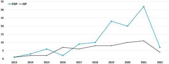 The 172 papers have been published in 82 journals and two different books. However, only 15 journals have published three or more papers on EEJSPs. Overall, these 15 journals have published 89 papers, more than half of the papers found. Table 1 reports the list of journals and the number of papers published in each journal, including only those journals that have published three or more papers.