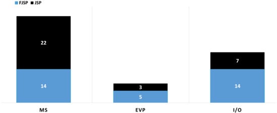 Number of JSP and FJSP publications incorporating energy-efficient strategies (MS—machine speed adjustment, I/O—turn-on and turn-off status, EVP—energy variable price).
