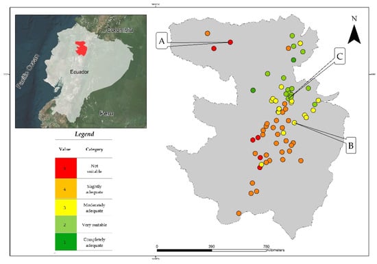 For the theoretical validation of the empirical indices, a universe of 71 cemeteries was started [51], proceeding to consider three cemeteries located in high (not suitable), medium (slightly suitable), and low (fully suitable) conditions, varying the analysis from 10, 8, and 6 variables and noting that the results are related to the criteria initially determined in this study and to the map obtained (Figure 1), which represents the comparison pattern for all cases.