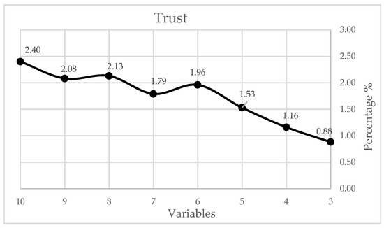 The water table, with a weight of 29.51%, the distance to water sources, with 21.26%, and the type of soil, with 10.36%, constituted 61.13% of the total; that is, these variables highly influence the suitability of the area to implant a cemetery and, therefore, the probability of the transport of contaminants due to the decomposition of corpses, in the environmental matrices that surround a cemetery. The consistency calculation of the Saaty matrix gave a value of 2.40% [71], which indicates that the ranking of the variables is adequate and consistent. If the empirical equations obtained are validated by changing the number of variables and, therefore, their coefficients, through the consistency relationship, percentages less than 10 are obtained (Figure 2), which means the use of the matrix is reliable.