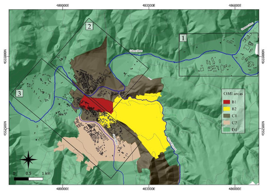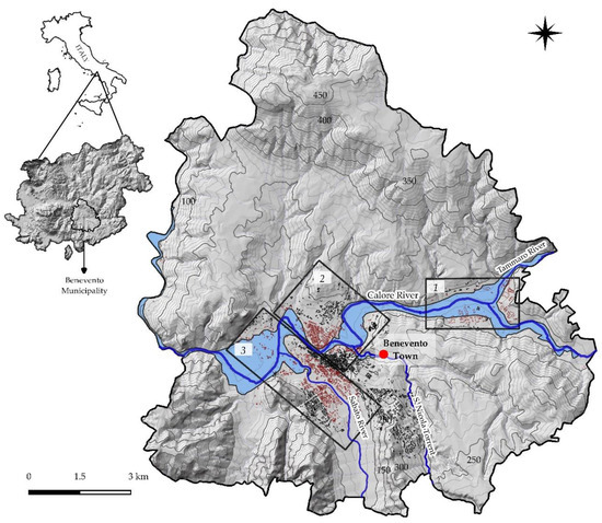 Administrative boundaries of the municipality of Benevento. Black rectangles demarcate the study areas: (1) Industrial area, (2) “Rione Ferrovia” area, and (3) “Rione Libertà” area. The buildings investigated are in red. Overflow of October 2015 of the Calore River is shown in light blue.