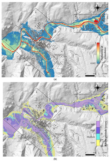 Figure 4 shows the flood hazard maps of the study area resulting from GIS processing and probability analysis [33]. The annual probability of exceedance (Figure 4a) represents the hazard level linked to the occurrence of floods of different magnitudes on an annual basis. The zonation map (Figure 4b) consists of four zones of the study area that can be flooded by events of a specific return period. Accordingly, using the local basin authority guidelines, the four hazard levels chosen are: (i) very high hazard, corresponding to 1–5-year floods; (ii) high hazard, corresponding to 5–30-year floods; (iii) medium hazard, corresponding to 30–100-year floods; and (iv) low hazard, corresponding to 100–500-year floods.