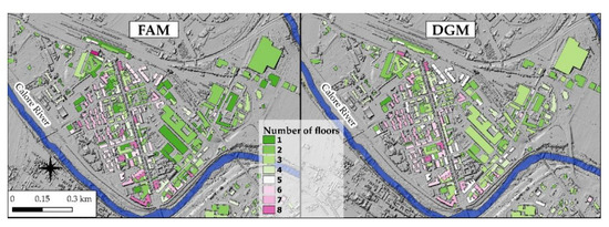 Table 2 shows the types of building surveyed and the average floor height computed for each building category. This information was used to derive the number of floors from the total height measured on the DSM, resulting in 1–8-floor buildings. The maps in Figure 5 show different results for buildings’ number of floors from direct field survey (FAM) and computational analysis (DGM).