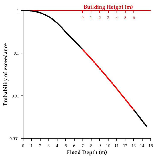 Figure 7 shows the generic flood hazard curve, obtained from a statistical analysis of the hydrometric time series from [33], used to define the hazard levels for each building considered, according to its position with respect to the watercourse and its altimetric characteristics. The generic hazard curve compares the probability of exceedance with the flood depth, for a maximum of 14.5 m from the hydrometric zero corresponding to a 500-year return-time flood and a probability of excess of 0.002. The building height, with respect to the hydrometric zero of the watercourse, is superimposed on the hazard curve (Figure 7, the red part of the curve) in order to estimate the yearly probability of exceedance of each structure and the portions that can be flooded and damaged.