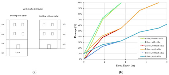To determine the direct damage from flooding, stage–damage curves were developed that relate the degree of damage to the water height during a flood event [25,54,55]. These curves are different and are functions of the (1) type of building, (2) number of floors, and (3) presence or absence of cellar. They are independent of individual flood events.