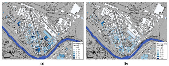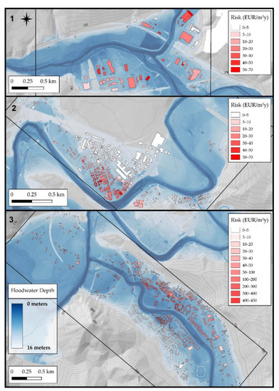Figure 10 and Figure 11 show the flood risk maps of the study areas obtained by Equation (9) from FAM and DGM, respectively. The spatial distribution of economic losses, which is given per unit area per year (EUR/y), shows the direct correlation of the damage with the distance from the water course, even though it highlights a heterogeneity of results as a consequence of the different building type and characteristics.