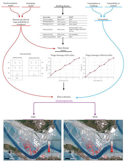In the case of flood risk, spatially distributed flood levels and probabilistic time recurrences for events of a given magnitude are usually used for estimate exposure and flood hazard [28,44], whereas vulnerability is assessed by evaluating the potential degree of damage to the exposed elements as a function of the flood water depth estimations.
