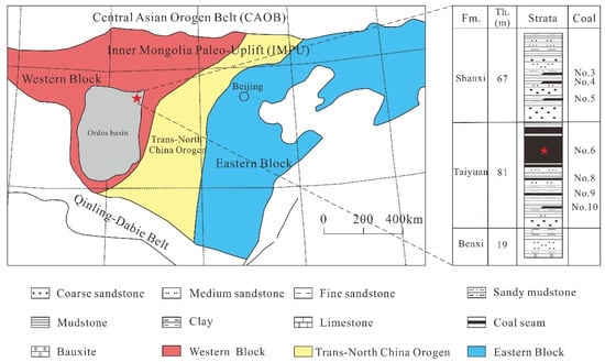 Coal is an organic sedimentary rock; determining its accurate depositional age will help us to reconstruct the evolution history of the sedimentary deposits [1]. In general, the magnetic stratigraphic method [2], oil generation capacity of coals [3,4], palynology of coal [5], radiometric dating of tonstein [6], and Re–Os isotopic analysis [1,7] can be used to determine coal depositional age. Recently, Tripathy et al. [1] proposed that the Re–Os isotopic analysis was a viable method of dating organic-rich sediments; whereas for terrestrial coals, the Re–Os age was not useful for determining the depositional ages because of the highly heterogeneous nature of the initial Os isotopic composition [7]. It is a challenge to obtain the direct age of non-marine-influenced coals in which there is no tonstein. With the improvement in analytical techniques and the development of Multi-Collector Laser Ablation Inductively Coupled Plasma Mass Spectrometry (MC-LA-ICP-MS), U–Pb isotopic analyses of single detrital zircon grains in sedimentary strata have become popular for determining the maximum depositional ages of host sediments [8,9,10,11], especially for the strata-absent preserved fossils [12] and biostratigraphic age controlling [13].