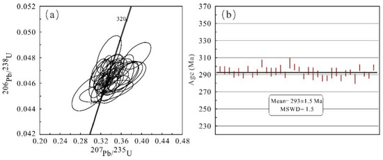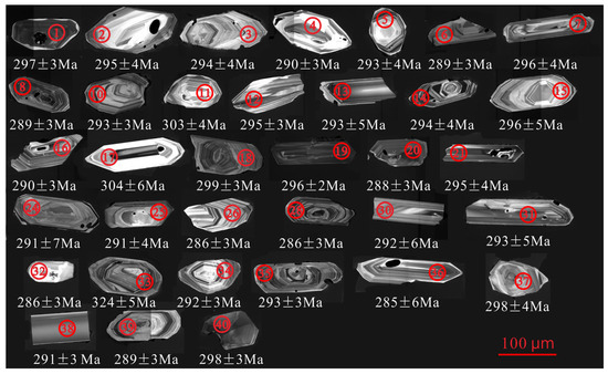 The zircon crystals within 50 to 150 μm in size were subhedral to euhedral (Figure 3). All zircon grains displayed clear oscillatory zones in the CL images and had high Th/U ratios (0.56–1.55, Figure 4, Table 1), indicating that they were magmatic zircons. A total of 34 out of 40 analyzed spots acquired the 206Pb/238U concordant ages in a narrow age population of 303–286 Ma, defining a single peak age with a weighted average age of 293.0 ± 1.5 Ma (MSWD = 1.5, Figure 5).