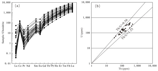 Chondrite normalized REE patterns (a) and Th/U ratios (b) of zircon grains in No. 6 coal, Heidaigou coal mine.