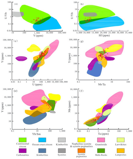 The chondrite-normalized REE pattern (Figure 5) revealed distinctively heavy rare earth elements (HREE) enriched in comparison with the light rare earth elements (LREE) characterized by LREE/HREE within 0.02–0.10 (Table 2). It also showed strongly positive Ce anomalies (Ce/Ce* = 2.4–224.6) and negative Eu anomalies (Eu/Eu* = 0.1–0.6). These data support that the zircon grains of the No. 6 coal had the common characteristics of magmatic zircons [23,24]. When plotting the REE data of these zircon grains on Y vs. U/Yb and Hf vs. U/Yb diagrams, all zircons fell in the continental zircon field (Figure 6a,b). In addition, the Y vs. U, Nb/Ta vs. Yb/Sm, and Nb vs. Ta diagrams indicated the majority had characteristics of zircons in intermediate-acid igneous rocks, such as granitoids and syenite pegmatites (Figure 6c–f).