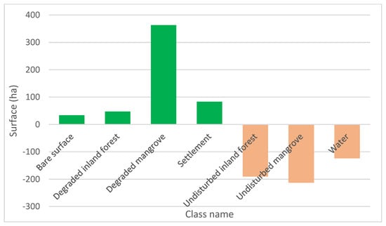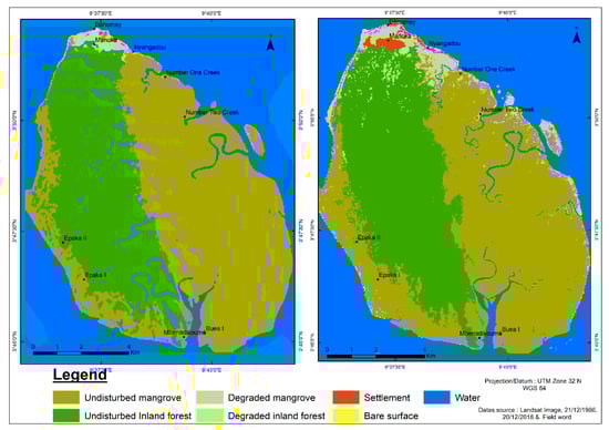 | 1986 | Bare Surface | Degraded Inland Forest | Degraded Mangrove | Settlement | Undisturbed Inland Forest | Undisturbed Mangrove | Water | Total | Total (%) | |