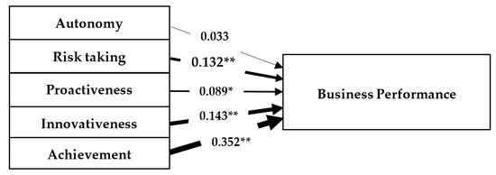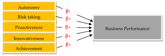 where Y is the business performance (dependent variable); β0 is the regression coefficient (constant); β1, β2, β3… are the regression beta values; and X1 = autonomy orientation, X2 = risk taking orientation, X3 = proactiveness orientation, X4 = innovativeness orientation, X5 = achievement orientation, and ϵi = error or residual (Equation (1)).