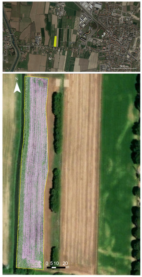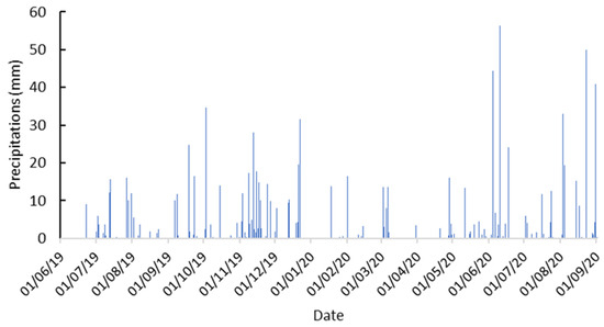 32]. The local climate presents sub-humid traits with an average temperature of 12 °C and approximately 800–850 mm/year of rainfall. Precipitation is mostly concentrated in the autumn and spring, based on data from the Regional Agency for Environmental Protection (ARPA); precipitation for the study period and the locality were also provided by the aforementioned agency, and are presented in