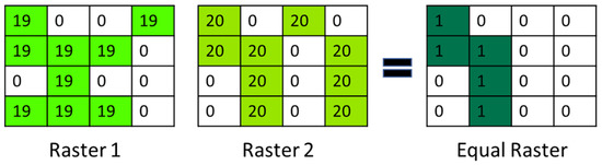 ® Pro program (v2.2.0 Environmental Systems Research Institute (ESRI), Redlands, CA, USA) as a raster file. With the help of the raster calculator function (part of the spatial analyst toolbox that allows the creation and execution of map algebra expressions) it was possible to find the same areas in each field in both years by comparing the two raster files from different years. The ‘equal to’ function (==) performs a relational ‘equal to’ operation on two inputs on a cell-by-cell basis, returning 1 for cells where the first raster equals the second raster, and 0 for cells where it does not, as shown in