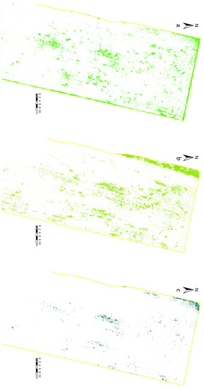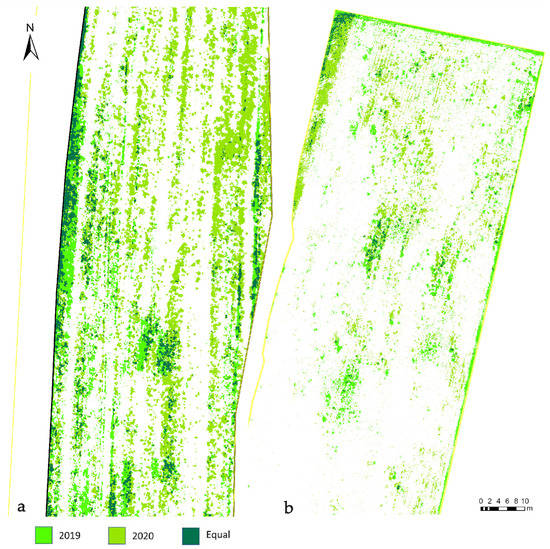 Figure 6a). The northern and eastern sectors of the field were much less infested. In 2020, the infestation appears to remain stable in the previously infested regions; however, it heterogeneously increased in the eastern and northern sectors (