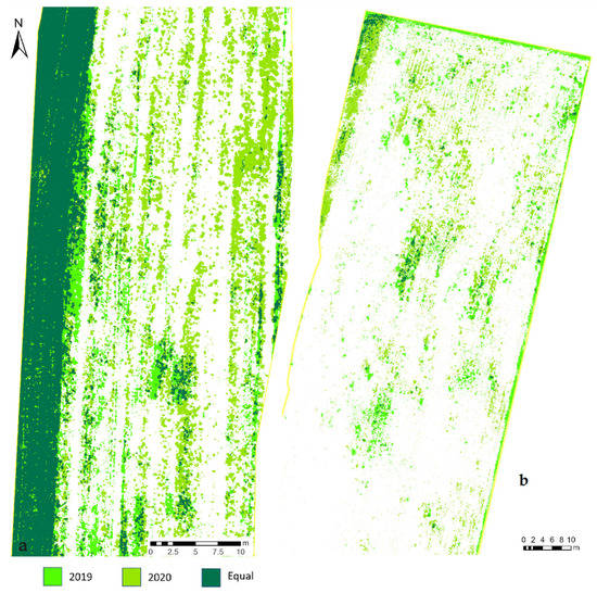 39]. After the equal area was determined, it was possible to calculate the percentage of weed distribution difference in the same field comparing two years using a simple Equation (2).