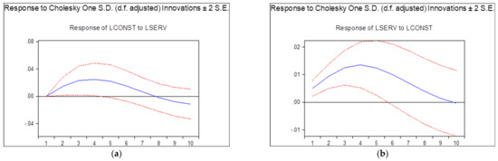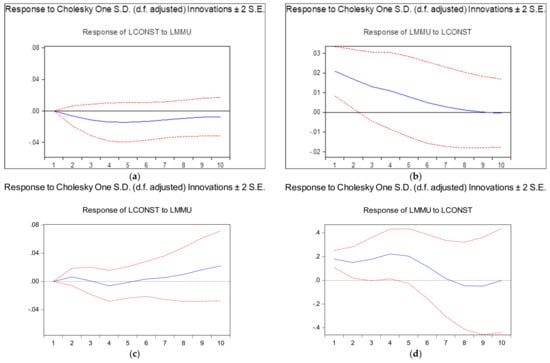 This study used the Cholesky dof (degree of freedom) as an IRF function, which is used for intersectoral linkages [79]. As the study focused on the construction sectors of the USA, China, and the UK, the CONST variable was thus used as an exogenous and endogenous variable.