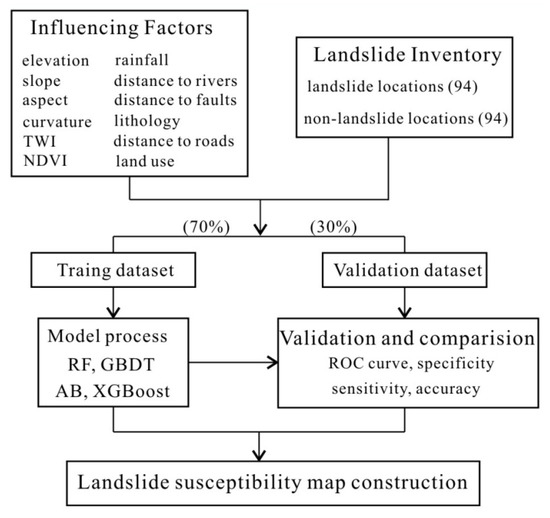 This study includes five stages for predicting LSM: (1) collecting equal numbers of landslide and non-landslide locations; (2) determining and normalizing the factors that directly or indirectly influence the occurrence of landslides; (3) analyzing the correlation and multicollinearity of selected factors; (4) delineating the area prone to landslides using the RF, AB, GBDT, and XGBoost models; (5) validating and comparing these models using several performance metrics. The ensemble models were implemented in the Python 3.7 environment. To view the official home of the Python programming language through https://www.python.org/. Meanwhile, the code related to models in this work is modified based on an open source Python library scikit-learn package (https://github.com/scikit-learn/scikit-learn, accessed on 26 April 2022). The 10-fold cross-validation and trial-and-error methods were used to determine the optimal parameters. A detailed flowchart of the proposed method is shown in Figure 3.