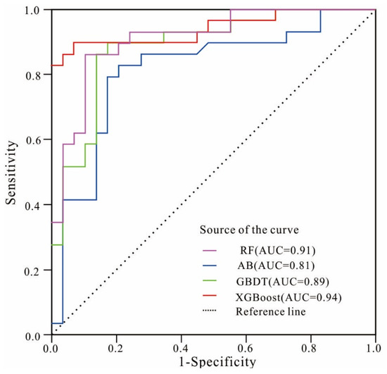 First, the ROC curve was used to validate and compare the accuracy of the RF, AB, GBDT, and XGBoost models, as shown in Figure 3. The performances of the models were evaluated using three statistic metrics (sensitivity, specificity, and accuracy), as presented in Table 2.