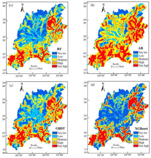 Specifically, the LSM results of the AB model were different from those of the other three models, as shown in Figure 5. The percentages of the highly susceptible areas (very high and high) accounted for approximately 30% of the total area for the maps predicted by the RF, GBDT, and XGBoost models, while those of the AB model accounted for more than 50%. The LSM result of the RF model was similar to that of the XGBoost model except for the very low category. The RF model classified 47% of the total area as a low susceptibility zone (very low and low), while 28.37% was classified as a zone of high susceptibility (very high and high). However, when the XGBoost model was used, 55.42% and 30.25% of the area were classified as the high and low susceptibility zones, respectively. In terms of the landslide susceptibility classification results (Figure 5), the XGBoost model performed similarly to the RF model.