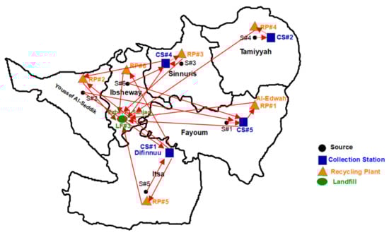 The current SWMS of Fayoum Governorate consists of six waste sources, five collection/transfer stations, one recycling plant, and four landfills. First, it is required to collect the waste generation data at the different waste sources in Fayoum. The amounts of the generated municipal solid waste in Fayoum are available at a district level, where Fayoum is divided into six districts as follows: Fayoum (S#1), Youssef Al-Seddik (S#2), Sinnuris (S#3), Tamiyyah (S#4), Itsa (S#5), and Ibsheway (S#6). Therefore, Fayoum is considered to include six sources of waste generation and the total amount of daily generated waste at each source (district) is assumed to be collected at the centroid of the respective district. The amounts of daily generated waste at the six waste sources are reported in