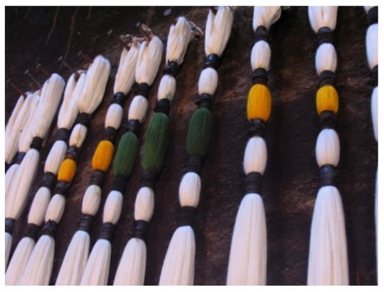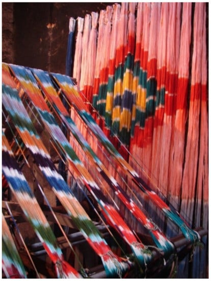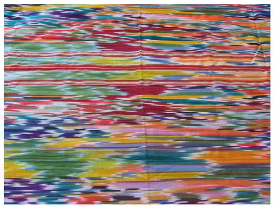 Another Maleksabet brother and a cousin are involved in the profession of dyeing []. They work in another house located in a village near the historic part of the city. A Zoroastrian family built this home and it retains some traces of weaving in the architectural details []. They use a typical dyeing technique to dye each part separately. They use rubber bands to tie warp threads before dyeing []. Colors penetrate each other through these rubber bands (Figure 3), resulting in a variety of colors for each thread, and unique patterns appear in each weaving [] (Figure 4). When weaving warp treads, weavers play pedals in the lowest part of the loom with their feet to move warps and use their hands to pass wefts through warps []. This technique makes each textile unique even before weaving.