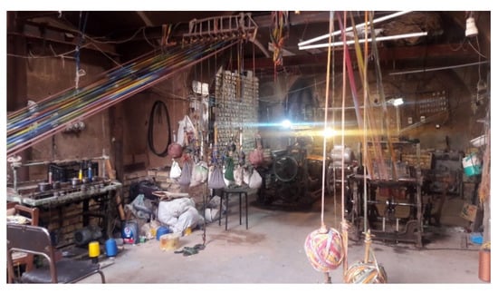 The Maleksabet family is one prominent example. This family’s ancestors have been involved in weaving darai for more than 150 years []. Still today, their karkhaneh architecturally illustrates the combination of living and working (Figure 2). All the family members, including women, men, and even children, collaborate in the process of weaving, from spinning strings to dyeing and weaving. According to the Maleksabet family, there were other weavers practicing in their homes in the past. But due to the expansion of the city in the modern era [], the weavers have moved their karkhanehs to neighborhoods near to the historic part of the city, or they have changed their professions []. Therefore, the Maleksabet’s karkhaneh is one of the few active places in Yazd where the weaving craft is being undertaken in the traditional home. Here, Maleksabet’s brothers and one of their sisters administer the karkhaneh.