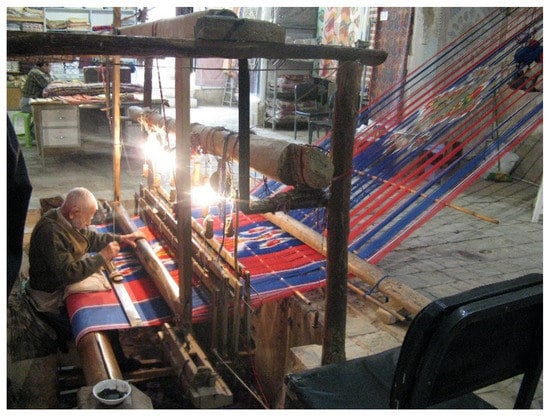 Applying ANT and considering Bennett’s thing-power [], textile weaving plays the role of multiple and dynamic relationships between humans and non-humans. The power of textile weaving vitalizes the karkhanehs and kargahs, and interrelated intangible and tangible cultural heritage as the last-chance tourism destination []. Weaving professions vitalize different materials, for example, cotton and silk, different patterns and colors in the modes of Shaarbafi, karbafi or daraibafi from one karkhaneh to another karkhaneh and reinforce intangible heritage as well as self-ordering of genders.