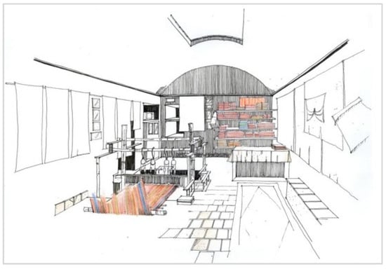 It should be noted that both terms, karkhaneh and kargah are applied interchangeably within the weaving culture. Architecturally, workspaces are located either in the basement or the ground floor where the temperature is fixed, an important component to maintain the thread and textile integrity. The weaving looms are installed on top of small recessed areas. Scheme 6 shows one of these traditional looms in cross-section. Workspaces can be separated from alleys by steep stairs. Typically, except for the entrance, the only openings are a combination of a small window or one or more holes for lighting, although the small holes mostly function as ventilation. As a result, noise can pass through the holes, and the sound of the weavers working can be heard by anyone passing in the alley. In the Khojasteh Darai-weaving Kargah, one local daraibafi weaver creates the textile for exhibition to tourists. The noise of the weaving instruments can be heard from a distance and guides the way for tourists to find them. Weaving activities in just a few such ateliers, or workshops, less than five, within neighborhoods have become cultural attractions that can lure the attention of local and foreign tourists []. Reviving such historical practices of weaving and textile fabrication offer the potential to supplement the local economy, especially when weaving is supplemented with other economic activities like blacksmithing and carpentry, and forgotten activities like raising and nurturing silkworms in tootestans, the place of white berry trees. Therefore, dyeing and spinning can also be revitalized again as part of the conservation of both tangible and intangible cultural heritage.