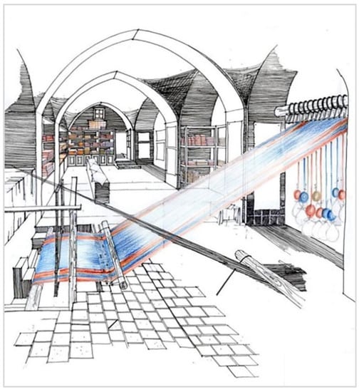 In the past, existing Yazdi professions such as carpentry, blacksmithing, dyeing, spinning, etc., flourished by supporting the weaving tradition. An inclusive, sustainable, and productive weaving industry and culture have shaped the rich cultural heritage of the region for many generations []. The vernacular architecture that is interrelated with the weaving heritage has also prevailed in various forms, adding to the cultural identity and heritage of the region, and housing the artisanal weaving looms and traditional weaving practices []. Today, this continues in commercialized workspaces as well as in touristic spaces where various buildings and once-filled recesses in karkhaneh are being revitalized and devoted to craft production. The result is a productive and generative process that strives to attempt to sustain vernacular built heritage and intangible craft heritage in Yazd [].