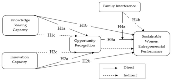 Female entrepreneurs encounter family obstructions that reduce the trade execution [69]. Women entrepreneurs tend to have restricted control over macro-level, standardizing desires more than men, and should allot more family needs than work [70]. In developing countries, the majority of the women are engaged, and bond for home routine work, and families in contrast with their entrepreneurship behavior. Both male and female entrepreneurs may interfere with their lives due to their routine duties. However, this trouble seems to be moderated in men’s lives and more noticeably felt by women entrepreneurs [71]. The women are trained to prioritize their families, very less families acknowledge females for business [13,72]. The negative role of family interference affects women’s business and technical skills, education, and performance. The family interference strengthens the relationship of opportunity recognition with sustainable women’s entrepreneurial performance.