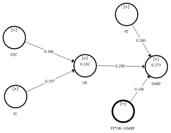 Table 6 shows the direct impacts such as; H1a KSC imapcts positively on OR, and supported by (β = 0.306; t = 6.203; p < 0.000). H1b demonstrate the positive effect of KSC on SWEP, and supported with (β = 0.089; t = 3.391; p < 0.001). H2a showed a direct impact of IC on OR, and supported with (β = 0.197; t = 4.231; p < 0.000). H2b outlined a significant, impact of IC on SWEP with (β = 0.057; t = 2.886; p < 0.004). H3a explained that OR affects on SWEP positively, and supported with the (β = 0.290; t = 5.001; p < 0.000). At the same time, H4a shows positve impact of FI on SWEP; therefore, H4a is supported with the values of (β = 0.380; t = 6.138; p < 0.000).