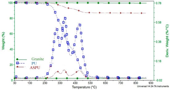 TGA was performed for natural granite, vegetable polyurethane and ASPU in a TGA-Q5000 TA Instruments, New Castle, DE, USA. The analysis was done with approximately 10 mg of each over a 30 to 935 °C temperature range with a heating rate of 10 °C/min, using an air flow of 60 mL/min during the test.